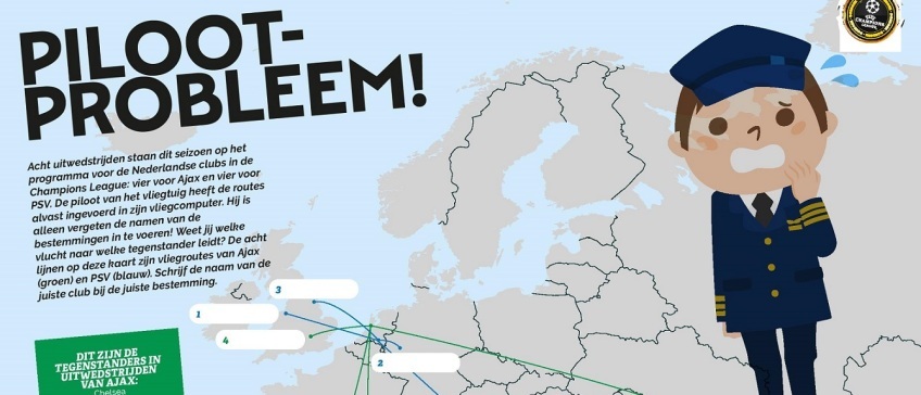 Acht uitwedstrijden staan dit seizoen op het programma voor de Nederlandse clubs in de Champions League: vier voor Ajax en vier voor PSV! De piloot van het vliegtuig heeft de routes alvast ingevoerd in zijn vliegcomputer. Hij is alleen vergeten de namen van de bestemmingen in te voeren! Weet jij welke vlucht naar welke tegenstander leidt?
