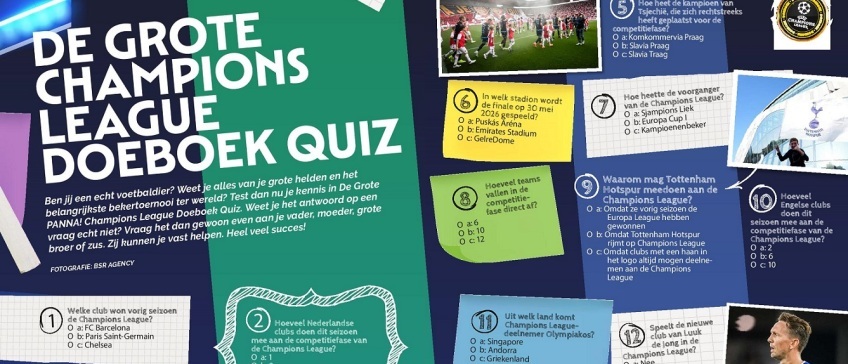 Ben jij een echt voetbaldier? Weet je alles van je grote helden en het belangrijkste bekertoernooi ter wereld? Test dan nu je kennis in De Grote PANNA! Champions League Doeboek Quiz. 33 vragen. We geven de eerste alvast weg: welke club won vorig seizoen de Champions League?