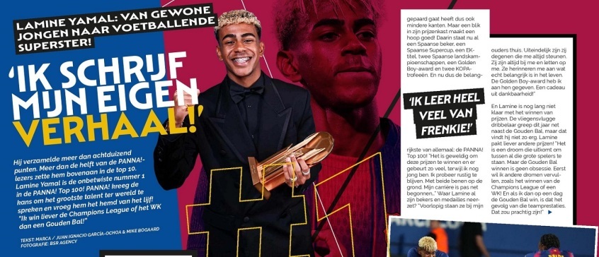 Hij verzamelde meer dan achtduizend punten. Meer dan de helft van de PANNA!-lezers zette hem bovenaan in de top 10. Lamine Yamal is de onbetwiste nummer 1 in de PANNA! Top 100! PANNA! kreeg de kans om het grootste talent ter wereld te spreken en vroeg hem het hemd van het lijf! "Ik win liever de Champions League of het WK dan een Gouden Bal!"